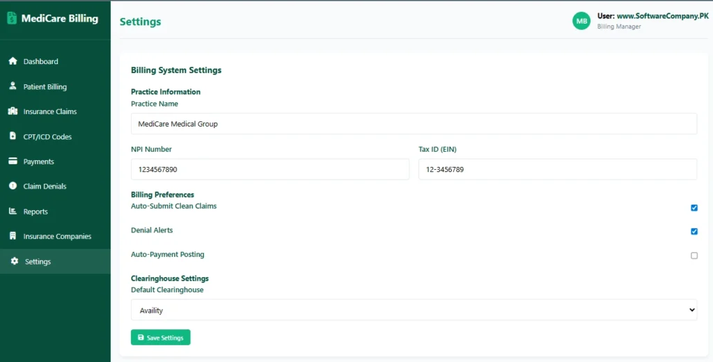- Set practice information (NPI, Tax ID)